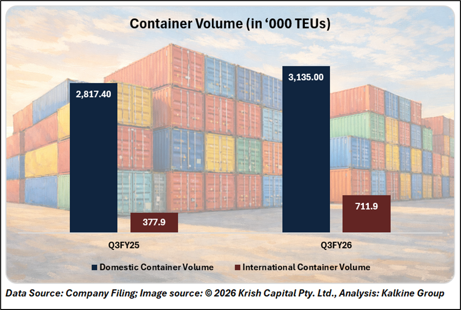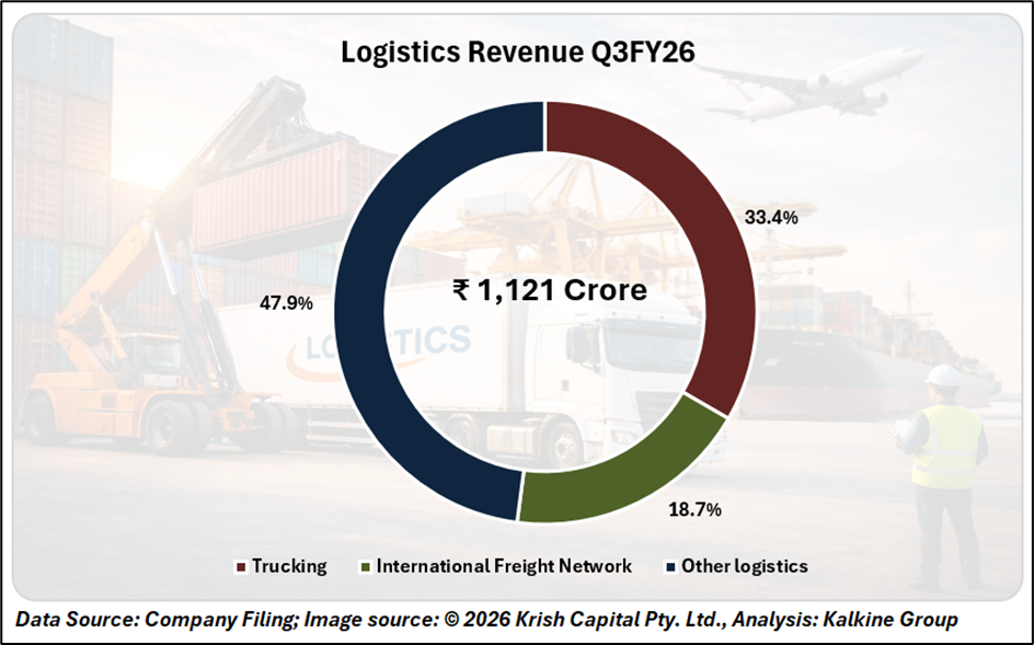 The logistics segment recorded a 62% year-on-year jump in revenue to ₹1,121 crore in Q3 FY26, driven by asset-light trucking services and the international freight network. The company aims to scale logistics revenue to ₹14,000 crore by FY29, supported by expanding multimodal parks and warehouse infrastructure.