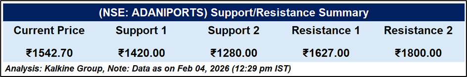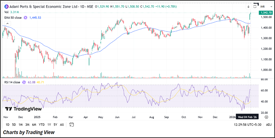 Adani Ports & Special Economic Zone Ltd maintains a constructive technical setup, trading above its upward-sloping 50-day EMA, which signals ongoing trend strength. The recent recovery toward ₹1,627 suggests renewed buying interest. With the RSI around 62, momentum remains favourable. As long as the stock stays above ₹1,420, the outlook remains cautiously optimistic.