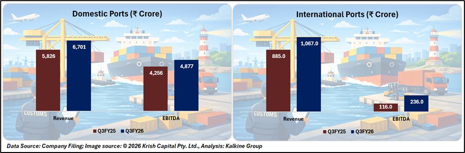 For the quarter ended December 2025, Adani Ports reported solid financial growth across key parameters. Revenue rose 22% year-on-year to ₹9,705 crore, while EBITDA increased 20% to ₹5,786 crore. Net profit grew nearly 21% to ₹3,043 crore, supported by higher cargo volumes and improved asset utilisation.