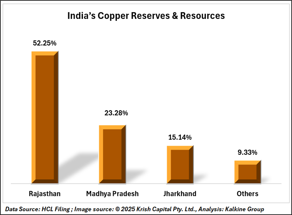 Within India, Rajasthan accounts for over 52% of the country’s total copper ore reserves, followed by Madhya Pradesh (23%) and Jharkhand (15%). These states remain central to India’s mining potential, though operational capacity and exploration investments lag behind global peers.