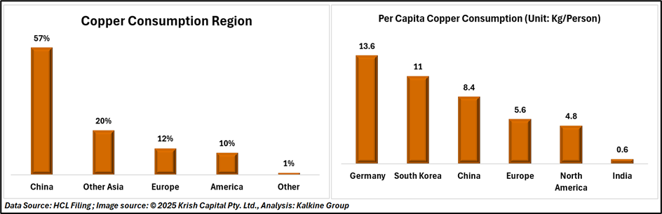 In per capita terms, Germany (13.6 kg) and South Korea (11 kg) lead global consumption, with the world average at 3.2 kg per person. India’s per capita copper use, however, remains among the lowest at 0.6 kg, indicating substantial untapped potential as industrialisation and electrification continue to expand.