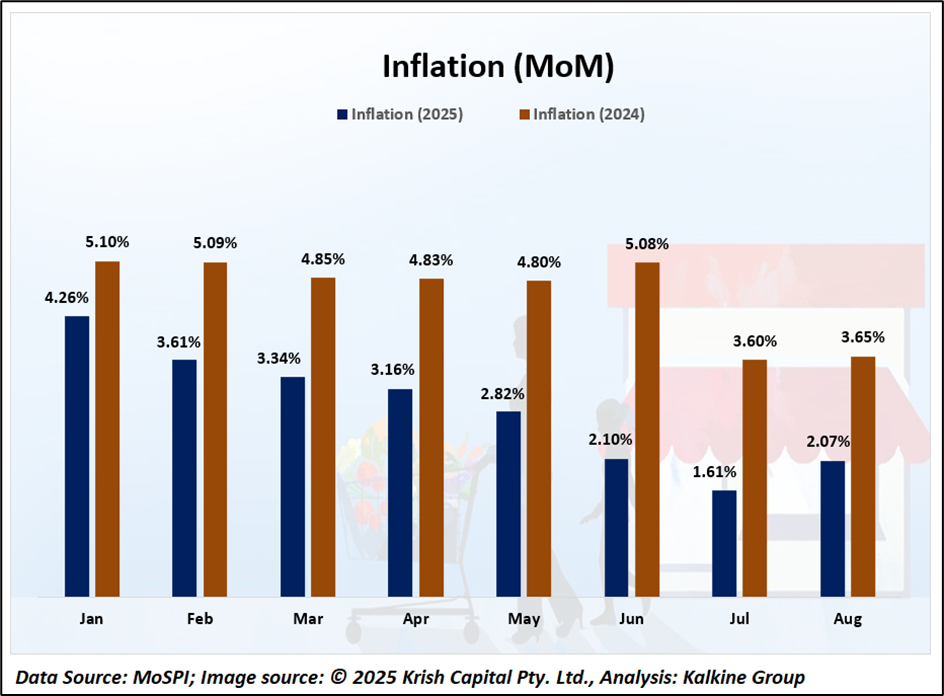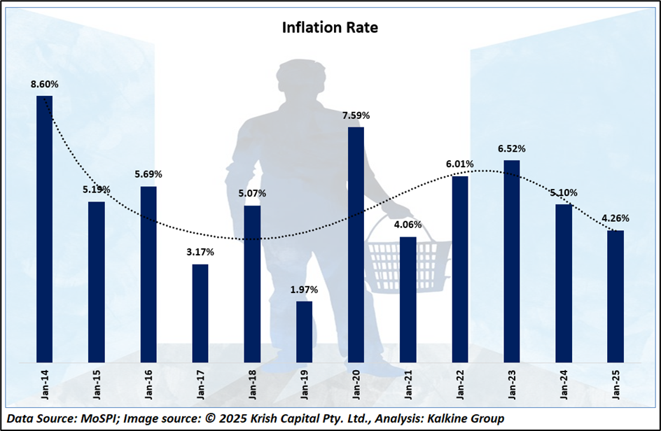 India has experienced notable fluctuations in consumer price index (CPI) inflation over the past decade. Starting from a peak of 8.6% in January 2014, inflation gradually eased in the following years, touching a low of 1.97% in early 2019. During the COVID-19 pandemic, inflation surged again, reaching 7.59% in January 2020. Since 2021, CPI inflation has been moderately stable, generally ranging between 3% and 7%, with variations largely influenced by food and energy prices.