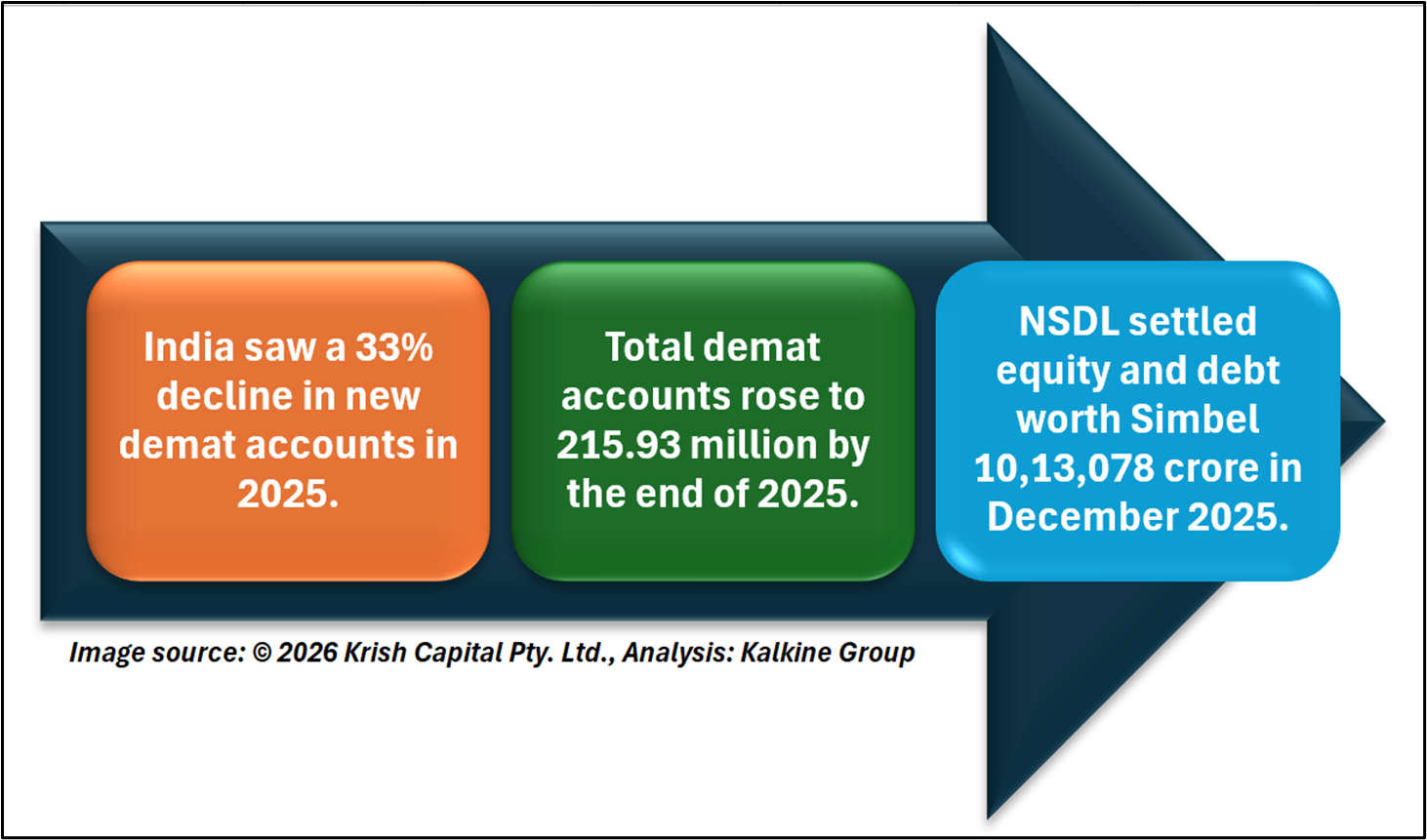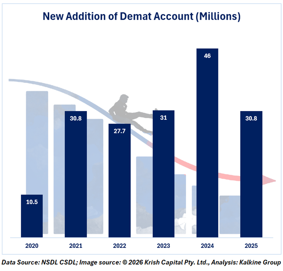 Even with fewer new accounts, the total demat account base grew to 215.93 million by the end of 2025, up from 185.3 million in 2024. This shows that the overall investor base continues to expand, even if fresh registrations are slowing.