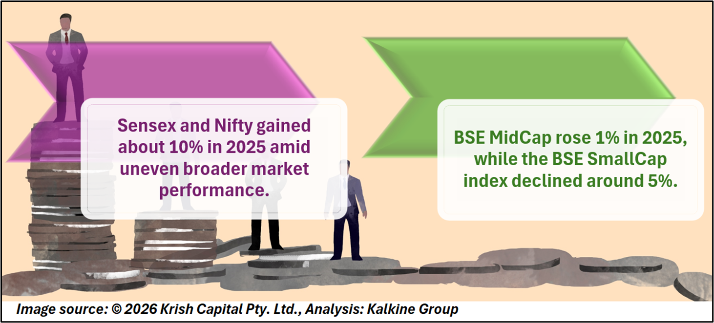 The stock market had a mixed performance in 2025. Sensex and Nifty ended the year with modest gains of around 10%, while the BSE MidCap index rose just 1%, and the BSE SmallCap index fell roughly 5%. Analysts pointed to market volatility, geopolitical tensions, foreign investor outflows, subdued corporate earnings, and high valuations as reasons for the slowdown. IPOs continued, but several new listings reported muted or negative returns, limiting enthusiasm among retail investors.