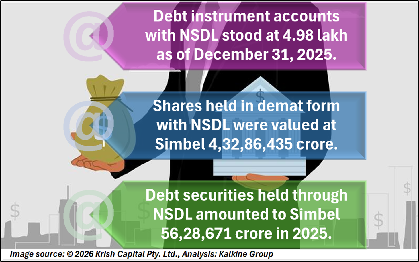 In December 2025, NSDL settled 2,316 crore equity shares worth Simbel 8,42,275 crore. NSE accounted for 2,199 crore shares valued at Simbel 8,08,124 crore, and BSE handled 117 crore shares worth Simbel 34,151 crore. Debt and bond settlements reached Simbel 1,70,803 crore, underlining NSDL’s crucial role in managing both equity and debt transactions.