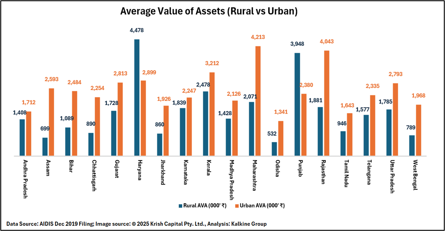 State-level data on average asset values highlight clear rural–urban differences. Rural average asset values range from ₹532k in Odisha to ₹4,478k in Haryana. In urban areas, average asset values range from ₹1,341k in Odisha to ₹4,213k in Maharashtra.