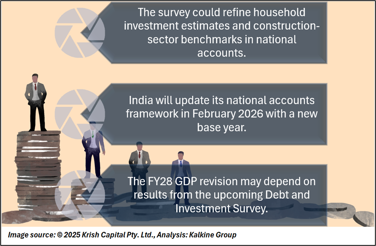 The All India Debt and Investment Survey is scheduled to be conducted from July 2026 to June 2027. Its findings could affect estimates of household investment and gross fixed capital formation, components that play a role in calculating overall GDP. Updated survey results may also enable revisions to construction-sector benchmarks, which are used to estimate value added within the sector.