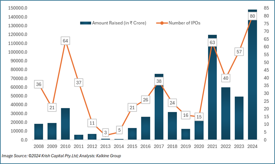 2024 - In 2024, the IPO market experienced a significant surge, with 80 IPOs raising ₹1,48,471 crore, marking a notable increase in both the number of listings and funds raised. This strong performance reflects investor confidence and a positive market outlook, as the IPO market continues to demonstrate robust growth despite ongoing global challenges. Noteworthy IPOs like NTPC Green Energy, Niva Bupa Health Insurance, and Swiggy were successfully listed, and upcoming IPOs such as Vishal Mega Mart (₹8,000 crore) and MobiKwik (₹572 crore) are going to get listed in December 2024.