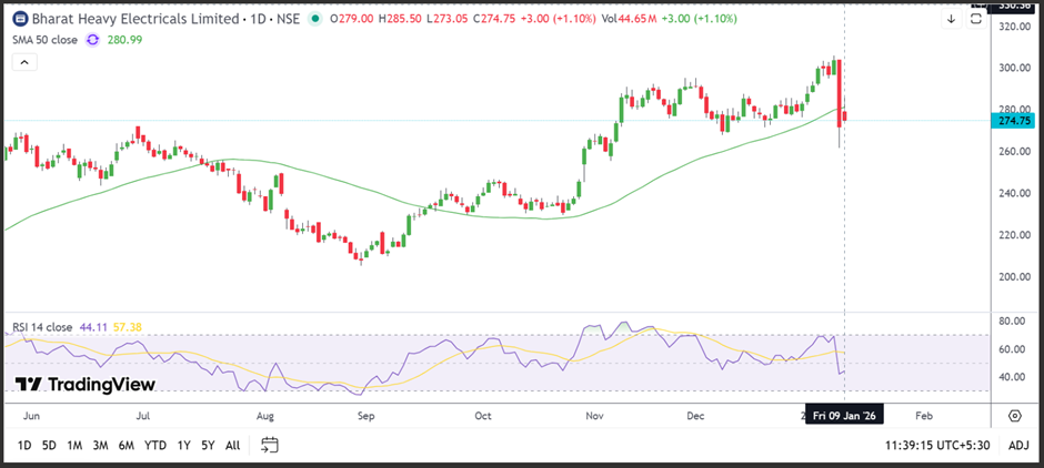 Shares of Bharat Heavy Electricals Limited (NSE:BHEL) were trading at ₹275.90, up 1.53%, on 9 January at 11:19 am, after seeing a sharp fall in the previous session. Including recent movement, weekly decline reached 8.14%.