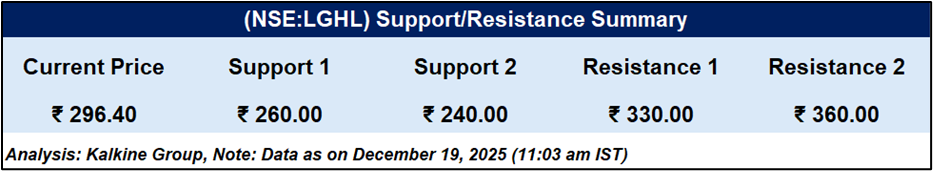 LGHL is trading at ₹296.40 and remains above its 200 periods simple moving average(SMA), reflecting a steady long-term trend. The stock shows nearby support around ₹260 and ₹240, which mark important reference levels. On the higher side, ₹330 and ₹360 stand out as key price points to watch.