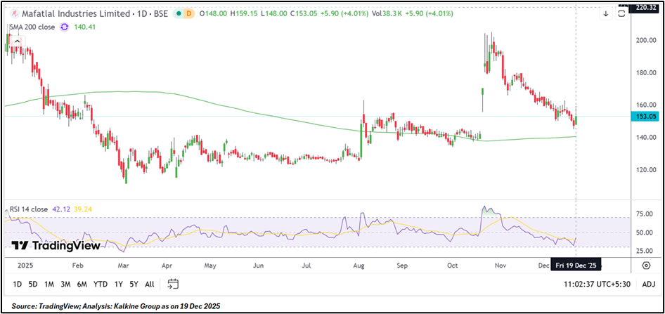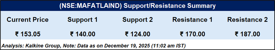 MAFATLAIND is trading at ₹153.05 and is positioned above its 200 periods simple moving average (SMA) Key support levels are seen at ₹140 and ₹124, where the price has shown buying interest in the past. On the higher side, resistance levels are identified at ₹170 and ₹187. These support and resistance levels outline the stock’s likely trading range in the near term.