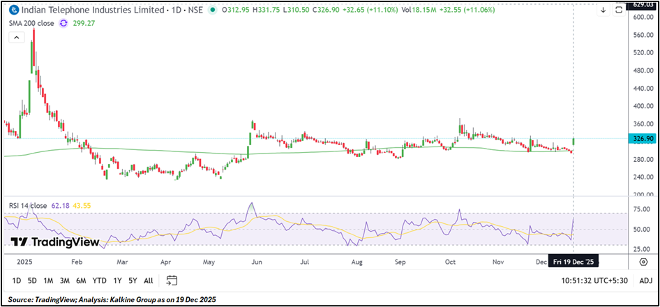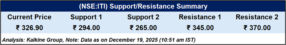 ITI is trading at ₹326.90 and is above its 200 periods simple moving average(SMA). This shows the stock is holding above a key long-term reference level. Immediate support is seen around ₹294, with another support near ₹265. On the higher side, ₹345 is the first resistance level, followed by ₹370. These support and resistance levels help outline the stock’s short-term price range in a simple and clear way.