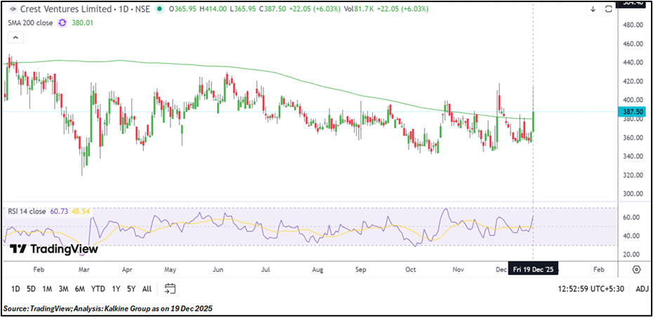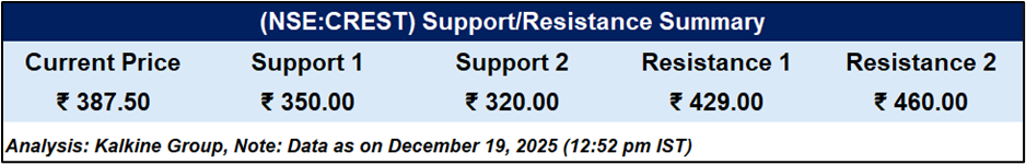 CREST Ventures is trading at ₹387.50 and remains above its 200-periods simple moving average (SMA), indicating a stable long-term price structure. The 200 SMA continues to act as an important reference point for assessing the broader trend. Immediate support levels are seen around ₹350 and ₹320. On the higher side, resistance levels are placed near ₹429 and ₹460. Price action is likely to show activity around these levels.