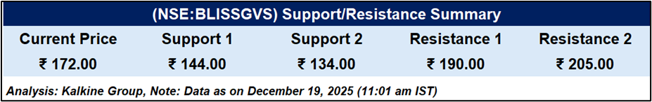 BLISSGVS is currently trading at ₹172.00, above its 200-periods simple moving average (SMA). The stock shows support levels at ₹144 and ₹134, where price could find stability if it moves lower. On the upside, resistance levels are at ₹190 and ₹205, Keeping an eye on these levels provides a clear view of the stock’s potential price movements in the near term.