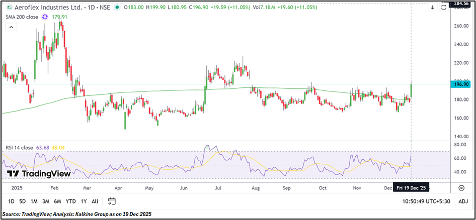 AEROFLEX is currently priced at ₹196.90 and is holding above its 200-periods simple moving average(SMA). If the price moves down, it may find support near ₹175, with the next level around ₹162. On the upside, the stock may face resistance around ₹216, followed by ₹230. These levels give a basic view of where the price could move in the near term.