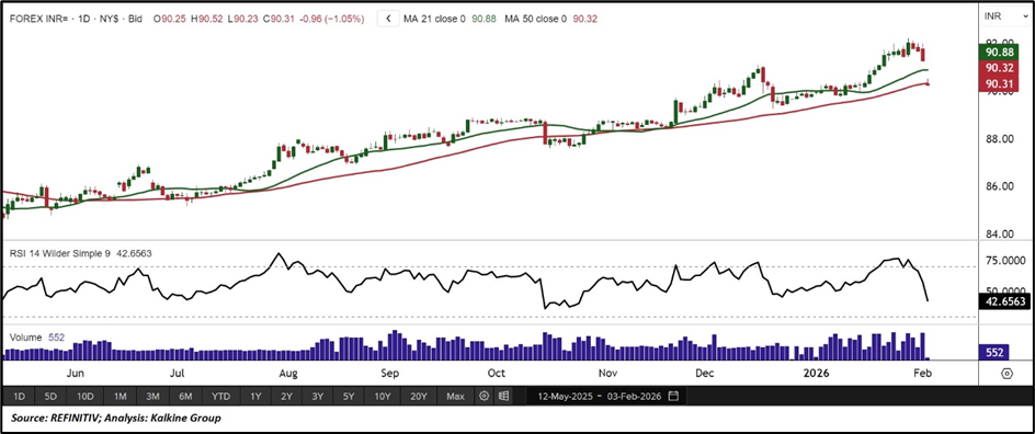 From a technical perspective, USDINR spot prices remain below the 21-day and 50-day Simple Moving Averages at INR 90.88 and INR 90.32, which continue to act as immediate resistance following a red candlestick session. The near-term tone has softened after a single-day decline of more than 1.00%, indicating a period of consolidation after recent gains. Momentum has moderated, with the 14-day RSI easing to 42.65 after moving away from overbought territory. On the downside, support is seen near INR 88.00 and 86.00, while resistance is located around INR 92.00 and INR 94.00.