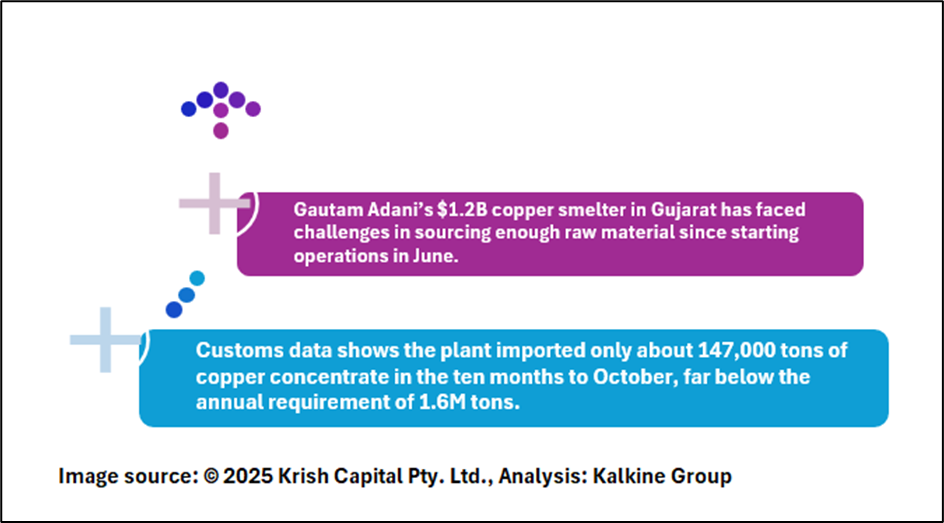 Gautam Adani’s $1.2B copper smelter in Gujarat, operated by Kutch Copper Ltd., has struggled to source sufficient raw material since commencing operations in June. According to customs data cited by Bloomberg, the plant has imported approximately 147,000 tons of copper concentrate in the ten months to October, significantly below the 1.6M tons needed annually to run at full capacity. In comparison, rival Hindalco Industries Ltd. imported over 1M tons during the same period.