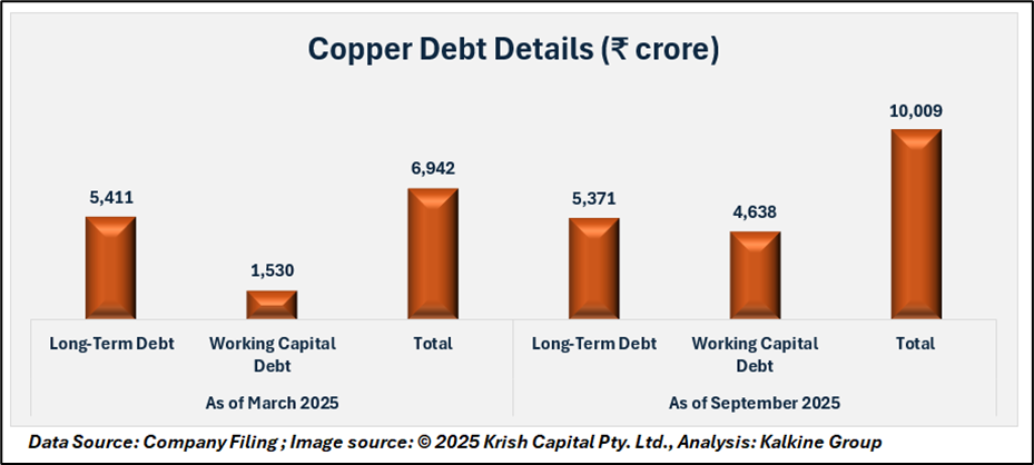 Kutch Copper’s debt position has grown over the past 18 months. As of Mar-24, the segment reported total debt of ₹ 3,578 crore, including ₹ 5,411 crore in long-term debt and ₹ 1,530 crore in working capital debt. By Mar-25, total debt increased to ₹ 6,942 crore, with long-term debt at ₹ 5,371 crore and working capital debt at ₹ 4,638 crore. As of Sep-25, total debt rose to ₹ 10,009 crore, reflecting the funding required to support operations and expansion plans.