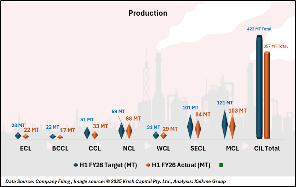 For H1 FY26, Coal India reported a mixed operational and financial performance. Coal production declined 3% year-on-year to 357.08 MT, while coal offtake also fell 3% to 329.14 MT. Overburden removal decreased 3% to 855.78 million cubic metres, pointing to moderated mining activity across subsidiaries.