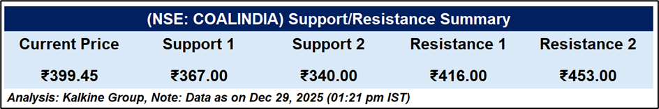 Coal India’s near-term sentiment is supported by the proposed subsidiary listings and a constructive technical setup. However, earnings pressure, softer volumes, and margin compression temper the outlook. Sustained upside will depend on regulatory clarity, operational recovery, and a decisive breakout above key resistance levels.