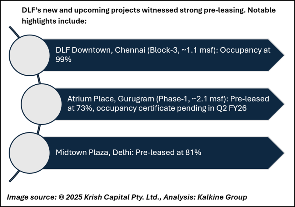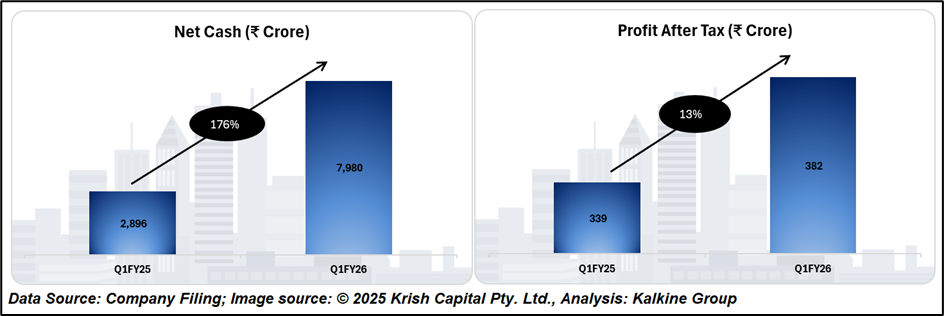 In Q1 FY26, DLF achieved new sales bookings of ₹11,425 crore, representing a significant 78% year-on-year increase, driven largely by successful launches within its Privana development portfolio. Meeting strong demand for premium and luxury residences, the company’s collections for the quarter totaled ₹2,794 crore, generating a healthy operating cash surplus of ₹1,420 crore and a net cash surplus of ₹1,131 crore.