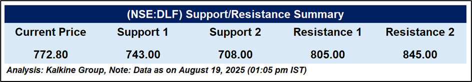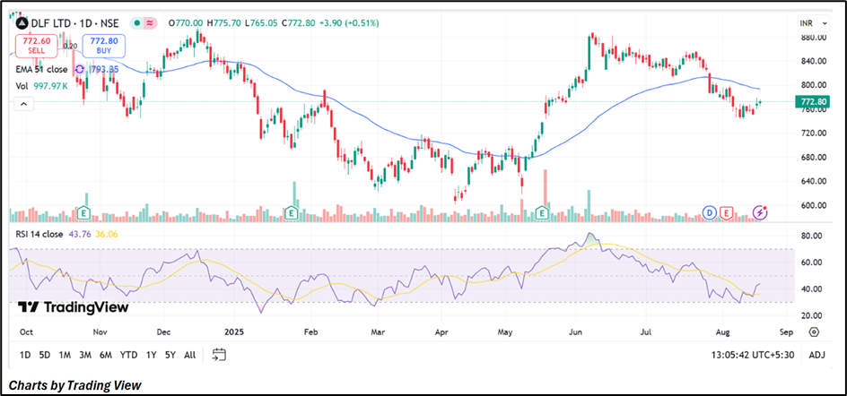 DLF Ltd is currently trading at ₹772.80 and exhibiting consolidation following a recent dip. The stock remains below its 51-day EMA of ₹793.85, which points to ongoing short-term weakness. RSI of 43.76 indicates modest bearish momentum, while still staying above the oversold threshold. A decisive move above ₹780 could signal the start of a recovery, while support is expected around the ₹805 level.