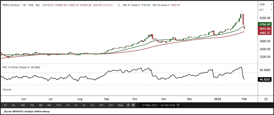 From a technical standpoint, spot gold is trading below its 21-day Simple Moving Average at USD 4,766.60, which now acts as immediate overhead pressure. The 50-day Simple Moving Average near USD 4,482.57 continues to provide broader structural support. Momentum has softened following the sharp one-day drop, reflecting aggressive profit-booking. The 14-day RSI has eased to 46.82 after retreating from elevated levels, pointing to moderating momentum. On the downside, support is located near USD 4,400.00 and USD 3,800.00, while resistance is seen around USD 4,900.00 and USD 5,500.00.