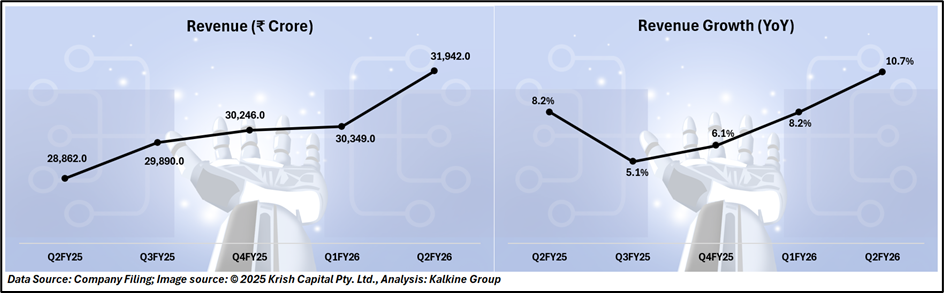 HCL Technologies Ltd (NSE: HCLTECH) has reported a 10.7% (YoY) rise in consolidated revenue for the quarter ended 30 September 2025 (Q2 FY26), reaching ₹31,942 crore, driven by strong deal ramp-ups and sustained demand across its IT and engineering services verticals. Sequentially, revenue grew 5% from ₹30,349 crore in the previous quarter.