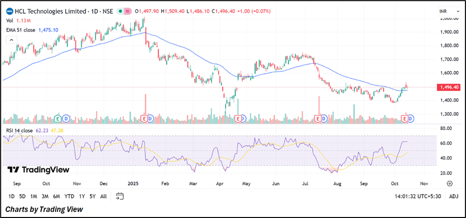 HCL Technologies trading at ₹1,496.40, holding slightly above its 51-day EMA at ₹1,475.10, indicating short-term support. The RSI at 62.23 suggests improving bullish momentum but nearing overbought territory. Sustaining above ₹1,560 could trigger further upside, while immediate support lies near ₹1,430, followed by ₹1,370 on the downside.