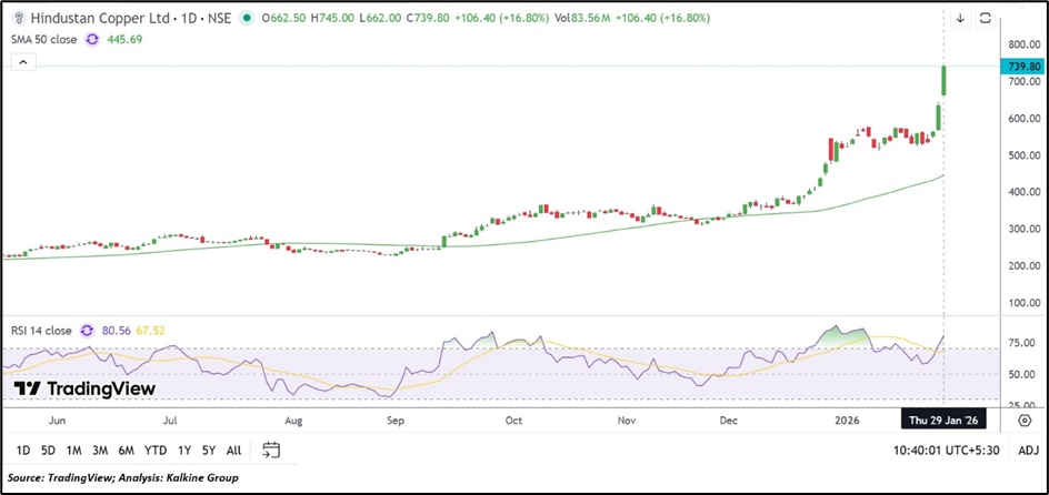 On 29 January 2026, Hindustan Copper Ltd extended its strong rally, rising 16.80% to trade near ₹739.80. The advance reflects firm global copper prices, supported by tight supply expectations and a weaker U.S. dollar, while aluminium prices remain near multi-year highs. Elevated trading volumes and rising retail participation underscore sustained market interest, mirroring broader strength across global base metal markets.