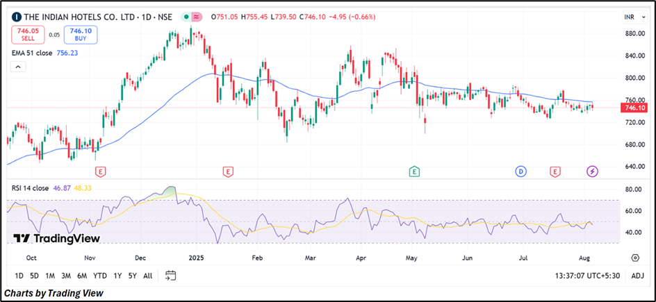 IHCL’s Q1FY26 results highlight its resilience and disciplined execution amid operational challenges. Continued portfolio expansion, healthy demand, and margin stability reinforce long-term growth visibility. While fundamentals remain positive, near-term stock action may stay range-bound unless it breaks decisively above resistance, offering limited upside in the immediate term.
