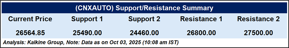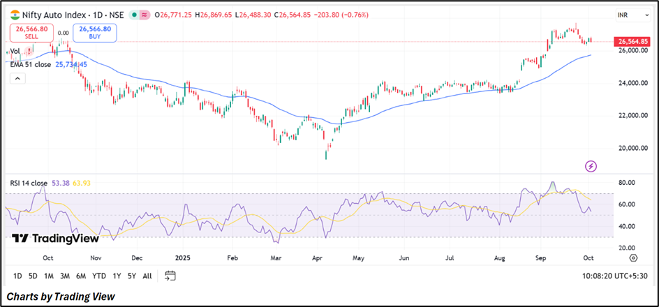 The Nifty Auto Index is trading at 26,564.85, down about 0.76% intraday. It remains above the 51-day EMA (25,731), showing ongoing medium-term strength. The RSI at 53 reflects easing momentum from recent peaks. Key support lies near 25,490, while a sustained push above 26,800 may re-energize bullish sentiment.
