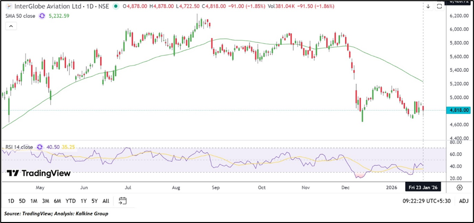 From a technical analysis standpoint, INDIGO continues to trade below its 50-day Simple Moving Average (₹5,232), which is acting as immediate resistance. However, the broader price structure suggests consolidation rather than breakdown following the recent decline.