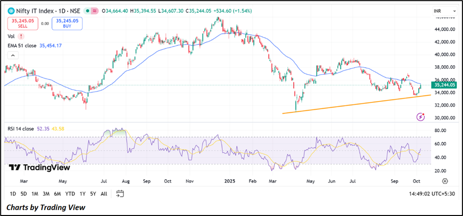 Nifty IT Index rebounded from an ascending trendline support near 33,900, indicating buyer interest at lower levels. Resistance is seen at the 51-day EMA around 35,450; a decisive close above this level could extend gains. RSI at 52 suggests improving momentum, but failure to cross immediate resistance may invite another round of selling pressure.