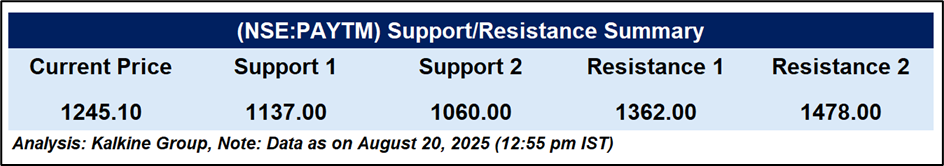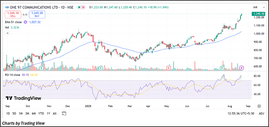 One 97 Communications Ltd (NSE: PAYTM) is trading at ₹1,245.10 (+1.54%), having touched a 52-week high on August 20, 2025. The price is positioned above the 51-day EMA of ₹1,027.32, indicating ongoing upward momentum. The RSI (14) at 80.92 reflects overbought conditions, which may lead to short-term consolidation or mild profit-taking. Immediate support levels are placed at ₹1,137 and ₹1,060, while resistance levels are seen at ₹1,362 and ₹1,478. A move beyond these resistance levels could extend the current trend, while pullbacks may retest key supports.