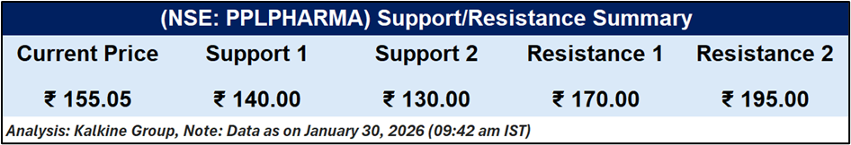 Momentum indicators remain soft, with the RSI close to 33, suggesting the stock is near oversold levels but has not yet shown a clear reversal. On the downside, support is seen at ₹140 and then ₹130. On the upside, resistance is placed near ₹170, with a stronger hurdle around ₹195.