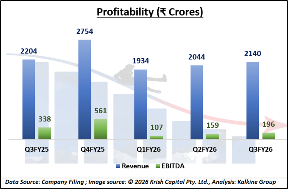 EBITDA for Q3FY26 declined 32% year-on-year to INR 239 crore, with margins contracting to 11% from 16% last year. For 9M FY26, EBITDA stood at INR 628 crore, down 36%. While cost optimization measures helped partially offset revenue pressures, operating leverage remained weak due to lower volumes. The company reported a net loss after exceptional items of INR 136 crore in Q3FY26 and INR 317 crore for 9M FY26.