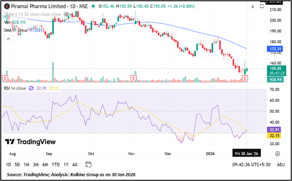 Piramal Pharma Limited is showing early signs that its downward trend may be stabilising. The stock is currently trading near an important support level around ₹155. However, it remains below the 50-day moving average near ₹173, which indicates the overall trend is still weak and short-term rallies may face selling pressure.
