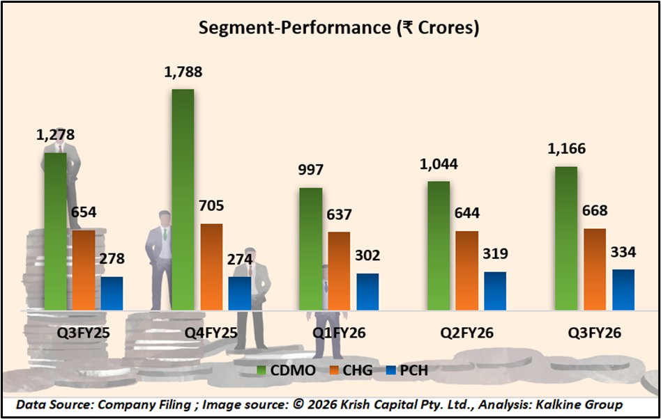 Segment-wise, Contract Development and Manufacturing Organization (CDMO) revenue declined 9% in Q3FY26 and 12% over nine months, reflecting cautious spending by global biopharma clients. Complex Hospital Generics (CHG) recorded marginal growth, while Piramal Consumer Healthcare (PCH) posted double-digit growth, driven by power brands and higher e-commerce contribution.