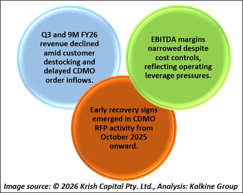 Piramal Pharma Limited reported consolidated revenue from operations of INR 2,140 crore for Q3FY26, down 3% year-on-year, while 9M FY26 revenue declined 4% to INR 6,117 crore. The moderation was primarily linked to inventory destocking by a customer for a large on-patent product, slower early-stage CDMO order inflows during H1FY26, and regulatory delays affecting inhalation anesthesia supplies from the Digwal facility to non-US markets.
