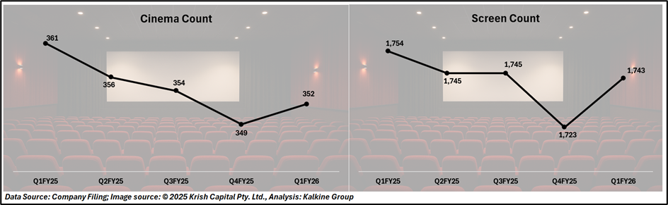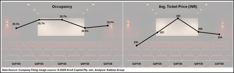PVR INOX recorded an occupancy rate of 22% in Q1 FY26, up from 20.5% in Q4 FY25, signaling a gradual but consistent recovery in footfalls. While average ticket price (ATP) moderated slightly to ₹254 from ₹258 in the previous quarter, it remains comfortably above pre-pandemic averages reflecting sustained consumer willingness to pay for the premium theatrical experience.