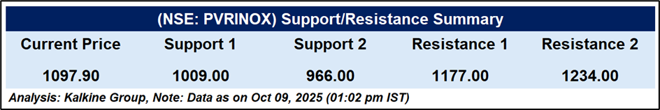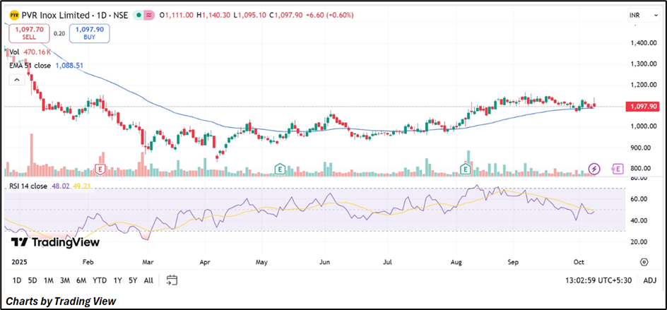 PVR INOX began FY26 on a strong note with rising footfalls, steady pricing, and network expansion. Regional and premium formats drove growth, supported by 20 new screens in Q1. The stock consolidates near ₹1,100, awaiting volume confirmation for breakout amid improving festive season momentum.
