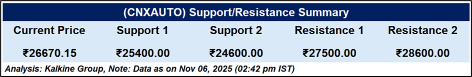 The Nifty Auto Index remains in a primary uptrend, trading above the 51-day EMA (26,415), though short-term momentum has softened. The RSI at 45 indicates weakening strength. Key support is placed at 24,400–24,600, with resistance near 27,500–28,600. Sustaining above the EMA maintains bullish structure; below it, a corrective phase may emerge.