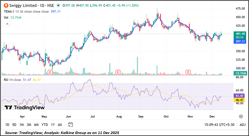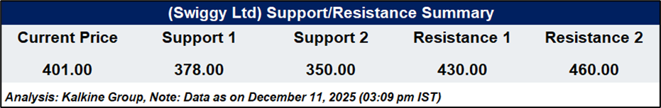 The Swiggy is currently trading at ₹401 per share. Immediate support levels are at ₹378 and ₹350, indicating potential buying zones. On the upside, resistance is seen at ₹430 and 460, which could act as selling pressure points. These key levels help traders gauge potential price movements and plan entry or exit strategies effectively.