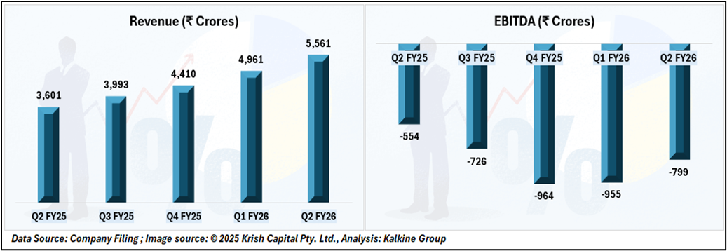 Swiggy has reported steady revenue growth over recent quarters. Revenue increased from ₹3,601 crore in Q2 FY25 to ₹5,561 crore in Q2 FY26. However, profitability remains a challenge. EBITDA stayed negative during this period, though losses narrowed from ₹955 crore in Q1 FY26 to ₹799 crore in Q2 FY26, with margins improving to -14%.