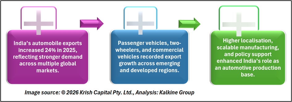 India’s automobile industry delivered a robust performance in calendar year 2025, with exports rising 24%, highlighting the sector’s increasing global competitiveness. Rising overseas demand and cost-efficient manufacturing enabled Indian automakers to expand their footprint across key international markets.