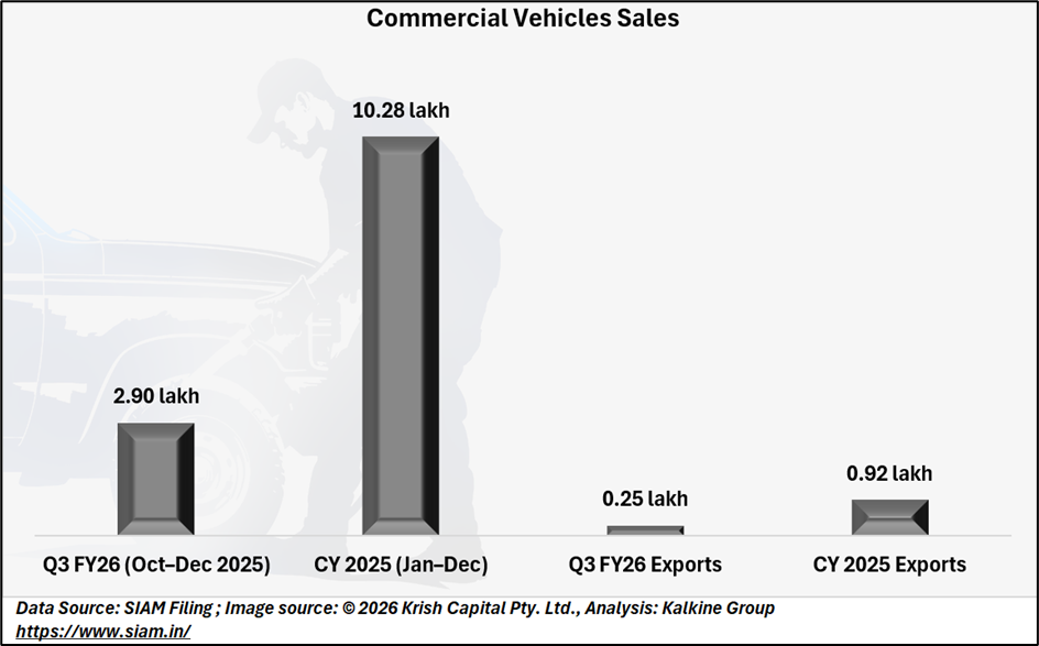 The commercial vehicle segment recorded strong momentum, aided by infrastructure activity and improving economic conditions. CV sales stood at 2.90 lakh units in Q3, rising 21.5% YoY, while full-year sales reached 10.28 lakh units, up 7.7%. Exports outperformed domestic growth, with Q3 exports at 0.25 lakh units (+13.6%) and annual exports at 0.92 lakh units, marking a sharp 27.1% increase and highlighting exports as a key growth driver.