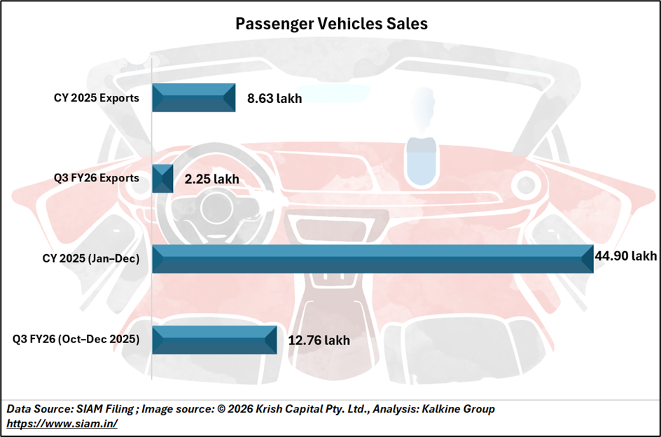 Passenger vehicle sales remained firm during the year, with full calendar year 2025 volumes reaching 44.90 lakh units, reflecting a 5.0% year-on-year increase. Export performance was equally encouraging, with PV exports totaling 2.25 lakh units in Q3, up 11.7% YoY. For the full year, exports reached 8.63 lakh units, registering a solid 16.0% growth and underscoring sustained demand for Indian passenger vehicles overseas.