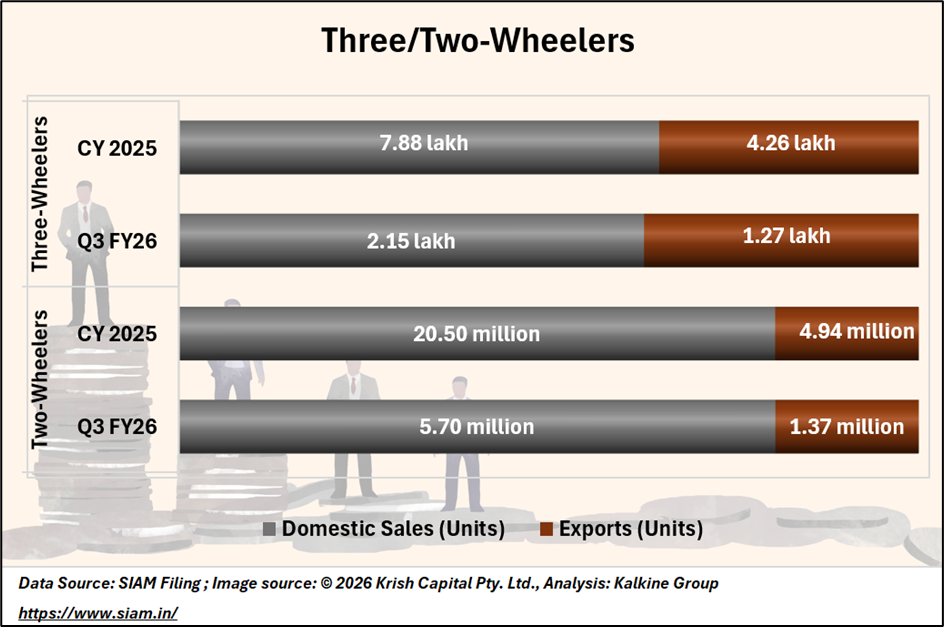 Two-wheelers remained the volume driver, with Q3 sales crossing 5.70 million units, up 16.9% YoY, while CY 2025 sales rose 4.9% to 20.50 million units. Exports were strong, jumping 24.3% YoY in Q3 to 1.37 million units and 24.2% for the year to 4.94 million units, supported by robust urban demand, the GST 2.0 rollout, and supportive macro policies. Three-wheelers also delivered solid growth, with sales up 14.0% YoY in Q3 and 8.2% for CY 2025. Exports outperformed sharply, surging 70.1% YoY in Q3 and 42.7% for the year, driven by rising demand from Sri Lanka and African markets.