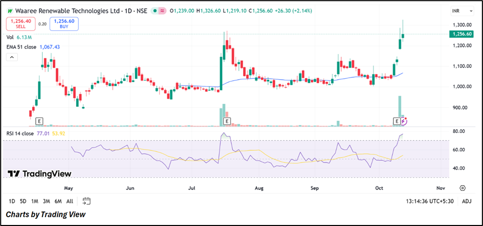 Waaree Renewable Technologies Ltd shares extended their rally, trading at ₹1,256.60, up 2.14%, after hitting a fresh all-time high of ₹1,326.60. The stock remains firmly above its 51-day EMA (₹1,067.43), indicating strong bullish momentum. The RSI at 77.01 signals overbought conditions, suggesting potential short-term consolidation, though the broader trend remains decisively positive following robust Q2FY26 earnings.